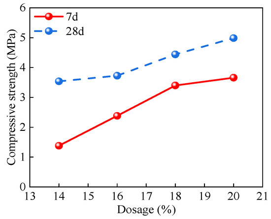 Figure 6 shows that the compressive strength of 7-day and 28-day is positively correlated with the content of the curing agent. Taking 7-day as an example, when the content of the curing agent increases from 14% to 16% and 18%, respectively, the strength of the solidified soil specimens increases by 72.61% and 42.74%, respectively. The compressive strength is obviously enhanced when the content of the curing agent is 14% to 18%, while the compressive strength only increases by 7.65% when the content of the curing agent is 18% to 20%. This is mainly because as the content of the curing agent increases, the content of active SiO2 and Al2O3 in the soil also increases. Under alkali excitation, the Al-O bond and Si-O bond in the vitreous body are destroyed and react with the dissolved Ca2+ to form hydrated calcium silicate (C-S-H) and hydrated calcium aluminate (C-A-H), which are cemented and filled between the loose particles of the soil. The compactness of the soil is enhanced, and the macroscopic performance is that the mechanical properties of the soil are improved. Upon further increasing the dosage of the curing agent, the strength improvement is not significant, indicating an optimal dosage of the curing agent. The strength of the solidified soil will not always increase rapidly with an increase in the dosage of the curing agent.