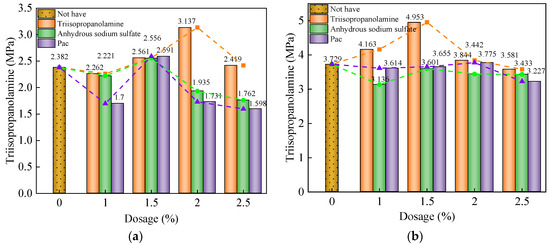 Based on the optimal ratio, triisopropanolamine, anhydrous sodium sulfate, and polyaluminum chloride were used as admixtures. The dosages were 1%, 1.5%, 2%, and 2.5%, respectively, and the numbers were T1-9~T1-20, respectively. The effects of the admixture dosage and type on the strength of solidified soil were studied. The specific test plan and test results are shown in Table 8 below.