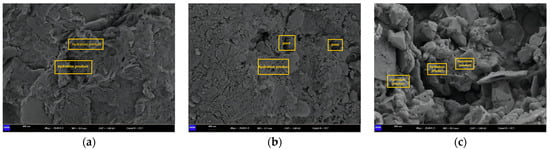 Comparing Figure 9a,c, with the increase in the amount of curing agent added, the generation of hydration and cementation products increases and fills the pores of the solidified soil sample. The soil particles are cemented into a whole structure, and some larger pores are also filled with flocs, thus improving the overall structure of the solidified soil. This is due to the increase in the amount of curing agent, which increases the content of active SiO2 and Al2O3 in the solidified soil sample. Under alkali excitation, the active Si-O and Al-O bonds break, leading to the volcanic ash reaction and the formation of hydrated silicate cementitious substances.