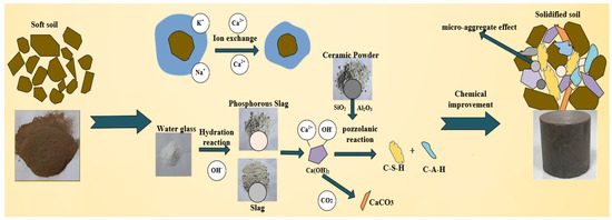 - Volcanic ash reaction: The addition of alkaline agents provides a good alkaline environment for exciting potential active tissues in soft soil and curing agents. Ceramic powder contains a large amount of active SiO2 and Al2O3, and three-dimensional network structures such as silica and aluminum oxide dissolve in an alkaline environment, generating [Al(OH)4]− and [SiO(OH)3]− plasma monomers. Subsequently, ionic monomers are attracted and connected via hydroxyl groups to form intermediate complexes. Then, they are dehydrated and condensed to form an oligomeric aluminosilicate vitreous sol. Under the excitation of an alkaline agent, the slag and phosphorous slag release a large amount of Ca2+ and further react with aluminosilicate vitreous sol to generate a gel such as calcium silicate hydrate (C-S-H) and calcium aluminosilicate hydrate (C-A-S-H). At the same time, the surplus Ca2+ will combine with OH− to generate Ca(OH)2 tabular crystals, which will absorb CO2 in the air in an alkaline environment to carbonize and generate CaCO3 whiskers. The Si-O-Si and other glass bodies in the soft soil structure also dissolve in the alkali environment, forming silicate series gel with the help of the curing agent. The soil system becomes more compact under the action of the generated series of polymers, hardening the rigidity of the solidified soil and strengthening the stability of the solidified soil.