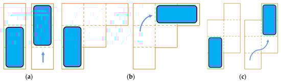 For a car’s simple forward and backward movement, only one grid is required (refer to Figure 1a). However, a turning radius must be considered for turning, which requires four grids to complete the movement (refer to Figure 1b). Similarly, four grids are needed for lateral movement (refer to Figure 1c). Considering these three basic movement patterns, it is possible to calculate the number of grids required for automated vehicles to enter and exit parking lots efficiently.