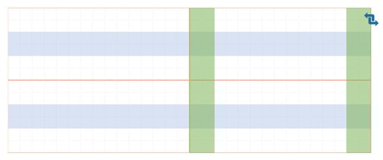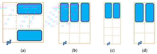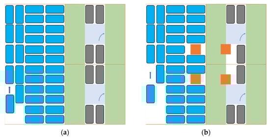 To facilitate research, this paper assumes that the road width of a traditional parking lot occupies two grids (as shown by the green-covered area in Figure 5). If a sub-area is used as an automated parking lot, the blue-covered area can be utilized as a parking space. Conversely, the blue-covered area can be used as a driving road if it is used as a conventional parking lot. The berth layout of the sub-area of the hybrid parking lot is illustrated in Figure 6a,b.