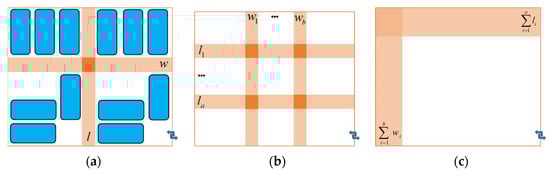 Compared to the mobile priority parking lot in the obstruction-free scenario in Section 2.2, the automated parking lot with obstacles (as seen in Figure 3a) has higher requirements for vehicle movement during the parking process. In Figure 3b, each size of the obstacle parking lot can be approximated as an mobile priority parking lot covered with rectangular obstacles (where represents the number of obstacles on the horizontal side and represents the number of obstacles on the vertical side). In Figure 3c, the space they occupy cannot be fully utilized due to the length and width of the obstacles. In the formula, represents the lateral length of the parking lot affected by the obstacle, and represents the vertical width of the parking lot affected by the barrier.