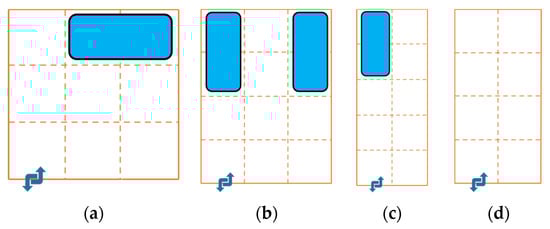 , are odd and (Figure 4a), is even, is odd, and (Figure 4b), is odd, is even, and (Figure 4c), and , are even and (Figure 4d). The obstructions for small car parks are usually located on the periphery of the car park. Hence, the remaining decision space for small car parks of the remaining size is consistent with that of accessible car parks. Additionally, the formula for obstruction parking lot capacity in the case of a large parking lot scale can be derived from the following: