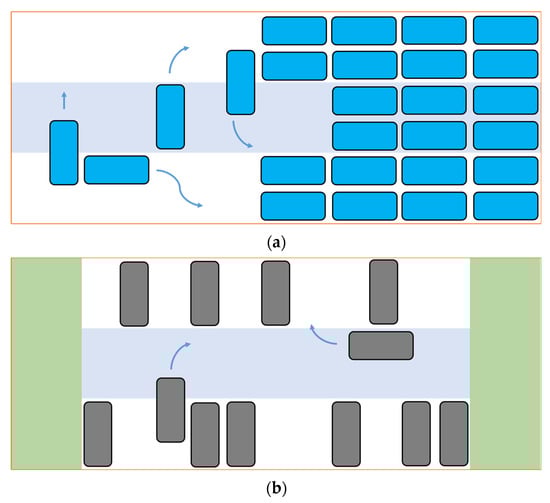 Hybrid parking lot design in sub-areas. (a) Automated subarea; (b) Conventional subarea.