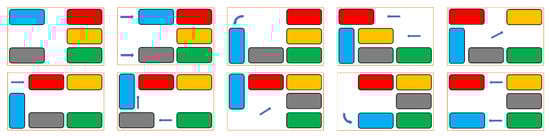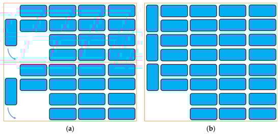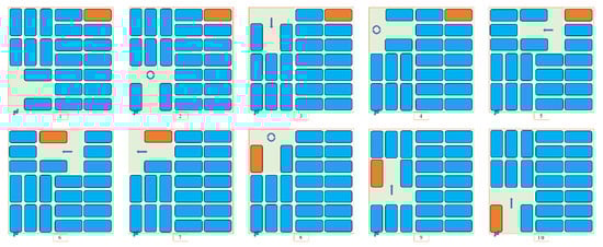 The superposition of sub-areas is applied to explain the impact on the parking lot’s capacity. The total number of grids of one 9 × 8 scale parking lot and two 9 × 4 scale parking lots is the same. Still, the remaining decision space exists in both sub-areas, resulting in the density and capacity of the stacked parking lot being less than that of an integral one. When the two automated sub-areas are superimposed, they are merged into a large-scale automated sub-area to maximize the number of parking lots. As shown in Figure 12.