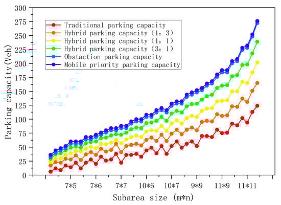 Figure 9 shows the optimization effect of the parking lot designed in this paper on the capacity improvement of the parking lot at different scales. In the 6 × 6 specification subarea, compared with the 12 vehicles in the traditional parking lot, the parking capacity (dark blue curve shown in Figure 9) of the mobile priority parking lot contains 60 vehicles, the capacity increases by 400%, and the parking capacity (red curve shown in Figure 9) of the hybrid parking lot () is 27 vehicles, and the capacity increases by 125%. In the 12 × 12 specification subarea, compared with 124 vehicles in the traditional parking lot, the parking capacity (dark blue curve shown in Figure 9) of the mobile priority parking lot design is 276 vehicles, with a capacity increase of 122.58%; the parking capacity (red curve shown in Figure 9) of the hybrid parking lot () is 165 vehicles, with a capacity increase of 33.06%. As the size of the parking lot continues to increase, the increase rate (slope of the curve in Figure 9) of the parking capacity of the five parking lot models involved in this paper continues to rise, and the traditional parking lot is also consistent with the reality due to the restrictions of roads and obstructions in the field.