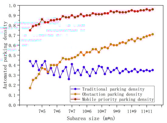 (2) For automated parking lots, that is, mobile priority parking lots and parking lots with obstructions, with the continuous increase in the scale of sub-areas, the parking density will approach one, approximately reaching the entire utilization state.