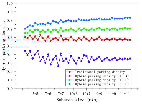 Figure 11 shows the optimization effect of the hybrid parking lot designed in this paper on improving the parking lot density under different mixing ratios and scales. Under the 12 × 12 specification subarea, the parking density (Figure 11 dark blue curve) of the traditional parking lot is 0.35. The parking density (red curve in Figure 11) of the hybrid parking lot () is 0.57, and the capacity is increased by 62.86%; the parking density (green curve shown in Figure 11) of the hybrid parking lot () is 0.70, and the capacity is increased by 100%; and the parking density (light blue curve shown in Figure 11) of the hybrid parking lot () is 0.83, and the capacity is increased by 137.14%.