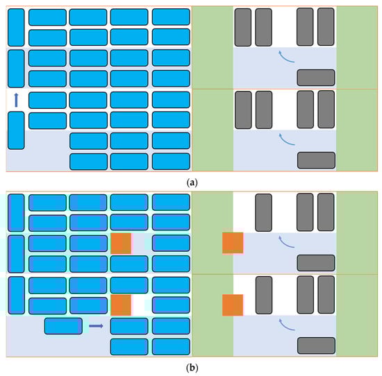 The influence of area superposition on the capacity and density of the parking lot: (a) 2 × 9 × 4 scale parking lot (30 vehicles); (b) 9 × 8 scale parking lot (33 vehicles).