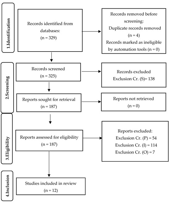 The four phases of systematic reviews have been followed (identification, screening, eligibility, and inclusion) [16]. At the beginning, 329 documents were retrieved from the PubMed, Scopus, Web of Science, and ProQuest databases, and 1 was added from an external source, of which 4 were duplicates. As a result, a total of 325 articles were downloaded. After reviewing the titles, abstracts, and full texts of the remaining articles using the same criteria, 138 studies were ignored in compliance with criterion 5 (Study). Out of the 187 remaining articles, 54 were eliminated for not meeting Criterion 1 (Population), 114 were dropped based on Criterion 2 (Intervention), and 7 were dropped for not meeting Criterion 3 (Outcomes). Finally, 12 papers were selected in the qualitative analysis. The four PRISMA-recommended phases are depicted in a flow diagram in Figure 1, along with the inclusion and exclusion criteria for each study in each phase.