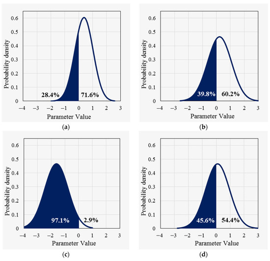 To further compare the differences between the two models, the parameter of the proportion of large trucks (PTV) is first used as an example to illustrate the effect of each factor on the mean value of the random parameters. In the basic random parameters model, this parameter follows a normal distribution with a mean of 0.376 and a standard deviation of 0.659 on all road segments, i.e., there is a 28.4% probability that the parameter will take a positive value and a 71.6% probability that the parameter will take a negative value on all road segments, as shown in Figure 1a. In the improved random parameters model, from Equation (36), the parameter follows a normal distribution with the mean () (i.e., the mean of the distribution of the parameter on each segment is not the same, depending on the values of the three variables of DSL, NL_4, and SAG) and the standard deviation of 0.857. For example, (1) for a steep uphill segment with four lanes and dual speed limits (NL_4 = 1, SAG = 1, DSL = 1), the parameter follows a normal distribution with a mean of 0.222 and a standard deviation of 0.857, as shown in Figure 1b; (2) for a steep uphill segment with four lanes and a single speed limit (NL_4 = 1, SAG = 1, DSL = 0), the parameter follows a normal distribution with a mean of −1.622 and a standard deviation of 0.857, as shown in Figure 1c; (3) for a nonsteep uphill segment with four lanes with various speed limits (NL_4 = 1, SAG = 0, DSL = 1), this parameter follows a normal distribution with a mean of 0.094 and a standard deviation of 0.857, as shown in Figure 1d.
