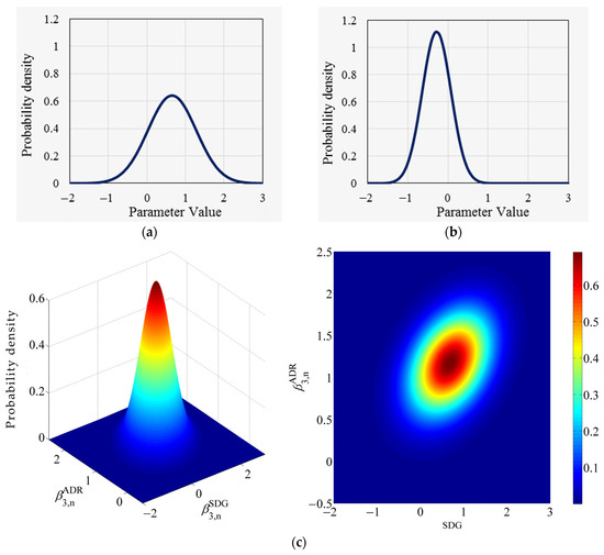 Further, the relationship between parameters and corresponding to the steep descending grade and the average distress ratio is analyzed. In the basic random parameters model, these two parameters follow normal distributions with mean values of 0.656 and −0.275 and standard deviations of 0.624 and 0.358, respectively, and the two distributions are completely independent of each other, as shown in Figure 2a,b. Whereas the results of the improved random parameters model show that the mean values of the two-parameters distributions are 0.684 and (−0.278 + 1.448 × DSL) and standard deviations of 0.614 and 0.402 (arithmetic square root of the diagonal elements in Table 3b), there is a significant correlation between the two distributions, with a covariance of 0.089 and a correlation coefficient of 0.361. The form of their joint distributions is shown in Figure 2c (the figure shows the roadway section where the DSL is = 0, i.e., a single speed limit).