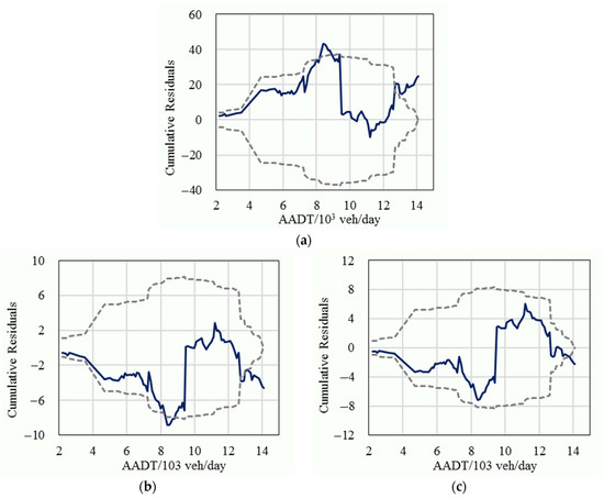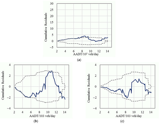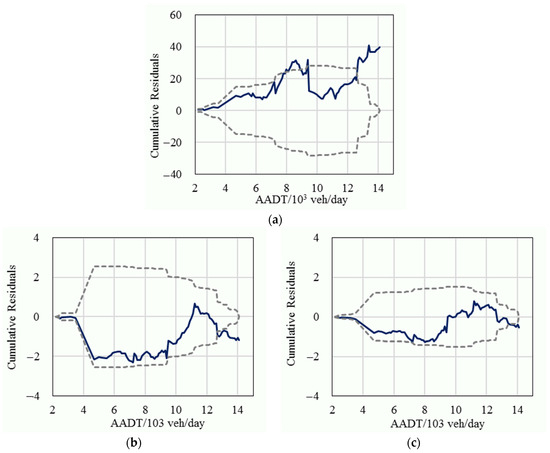 The cumulative residuals (solid line) and their 95% confidence intervals (dashed line) for minor crashes; (a) The fixed parameters model; (b) The basic random parameters model; (c) The improved random parameters model.