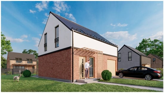 The designed building is a single-family detached house without a basement. The functional programme of the ground floor includes a garage, a living room with a kitchenette, a bathroom, a vestibule, and a storage room, while the first floor includes three bedrooms with a bathroom and a laundry room. In addition, a non-utility attic and a part of the garage are considered as space for sanitary installations (Figure 2). The property provides long-term housing for at least four occupants. The rectangular structure features a symmetrical gable roof with a pitch of 40 degrees. The design evokes the archetype of a ‘modern house’ with a gabled roof and a stylish façade in understated hues (Figure 3).