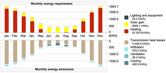 The following details an analysis of the monthly energy requirement. During the winter months, January (1903.68 kWh), February (1741.15 kWh), November (1584.92 kWh), and December (1904.70 kWh), there is a noticeable increase in energy demand (54.39% of annual demand). In contrast, during the summer period, which includes the months of June (413.62 kWh), July (399.17 kWh), and August (414.03 kWh), this demand significantly decreases (9.35% of annual demand). The spring and autumn months are characterised by moderate energy consumption, accounting for 36.25% of annual energy demand. Energy demand in the winter months is largely related to the need for heating, which also includes water heating, accounting for 93.38% of energy demand in the winter months. However, during the spring and summer periods, solar energy gains have a significant impact on the energy balance. Lighting and electronic equipment (excluding cooling and ventilation devices) generate a fairly constant, low energy demand regardless of the season (0.63% of annual demand) (Figure 4).