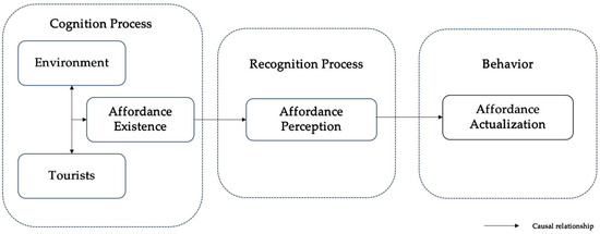 Affordance theory, originating from ecological psychology and introduced by Gibson [22], conceptualizes the environment’s potential to offer opportunities or constraints to organisms, either good or ill. Affordance exists as a relationship between an actor and the environment, relative to the action possibilities of the actor [23,24]. With a focus on a sequential realization of affordance, this theory provides a valuable framework for examining the consecutive progression from affordance existence to affordance perception and, ultimately, to affordance actualization [25]. Affordance existence refers to the inherent presence of action opportunities within a given environment or context [26,27]. In the context of tourism, tourists’ experiences are initially influenced by the potential actions that the physical tourism environment affords, followed by their perception of activities based on their capabilities, aligning with the core essence of affordance [28]. Therefore, affordance theory outlines a phased framework that encompasses the transition from what tourists can discern from the environment to how they emotionally engage with it and what actions they ultimately undertake, which corresponds to the overall tourism experience process [25,26]. However, the application of affordance theory in tourism has predominantly revolved around exploring the impact of digital technology on tourists’ experiences, encompassing social media [29], hotel mobile app [30], gamification in online travel agencies [31], and digital media usage [32,33]. The integration of affordance theory into the initial perception of tourists from cultural ecosystem services remains relatively limited.