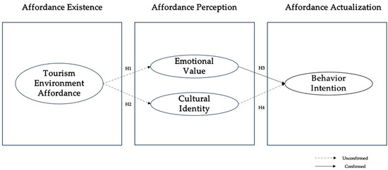 In this study, affordance perception includes emotional value and cultural identity. Tourists’ emotions play a pivotal role in their behavior responses such as revisit and purchase intention [68,69]. For example, Prayag et al. [70] gathered data from tourists visiting Petra to establish a correlation between tourists’ emotions and their behavior intentions. Brochado et al. [71] also substantiated the impact of tourists’ emotional value on their behavior intentions, including recommendations, through the analysis of survey data from Portuguese tourists. Moreover, Rasoolimanesh et al. [72] utilized data collected from Kashan, Iran, to provide evidence that the emotional value derived from tourists’ tourism experiences notably influences their behavior intentions.
