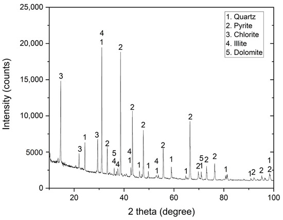 XRD pattern of the starting mine tailings sample (quartz: SiO2; pyrite: FeS2; chlorite: A5–6T4Z18, where A = Al, Fe2+, Fe3+, Li, Mg, Mn, or Ni, while T = Al, Fe3+, Si, or a combination of them, and Z = O and/or OH; illite: (K,H3O)(Al,Mg,Fe)2(Si,Al)4O10[(OH)2,(H2O)]); dolomite: CaMg(CO3)2 [17].