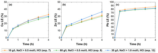 Based on the results obtained by the DoE, the leaching efficiency of the metals was mainly affected by (i) temperature (Cu and Zn), (ii) concentration of the acid (Cu and Zn), and (iii) availability of chloride ions in solution (Pb). Among the three optimum conditions identified (see Figure 2), the condition consisting of 10 g/L NaCl, 0.5 mol/L HCl, and 70 °C (exp. 7) was selected for further investigation. As the impact of NaCl concentration did not appear to have a strong effect on the leaching efficiencies of the metals, the solution containing its lowest concentration was chosen.