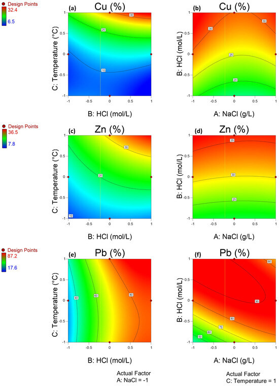 Contour plots of the leaching of Cu (a,b), Zn (c,d), and Pb (e,f) from the tailings sample obtained by the DoE. Fixed factor for (a,c,e) was NaCl at −1; fixed factor for (b,d,f) was temperature at +1.