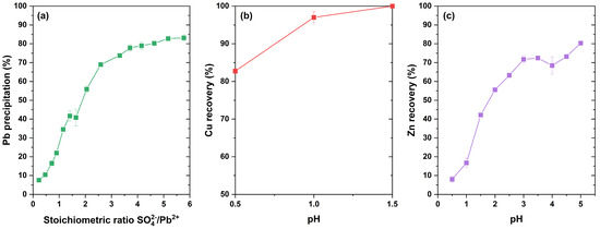 As shown in Figure 5a, about 70 to 80% of Pb was precipitated from the solution containing 3.3 to 5.7 SO42−/Pb2+ stoichiometric ratio. The high SO42−/Pb2+ ratio found in this study might be attributed to the consumption of SO42− from other ions present in the PLS. Therefore, an excess of SO42− was needed for the precipitation of PbSO4 from the solution. Additionally, other parameters could be investigated, like temperature and pH; however, an increase in pH is linked to precipitation of the other metals (target or undesirable metals).