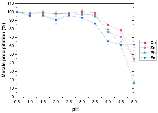 D2EHPA extractant was used for the recovery of Zn from the PLS. As presented in Figure 5c, 72% of Zn was recovered from the solution at pH 3.0; this agreed with [48,49], which determined the optimal pH range of 2.5–3.0 for Zn extraction in a chloride medium. pH values greater than 3.0 resulted in large precipitation of iron as iron (III) hydroxide, observed by the change in color to reddish-brownish and the formation of gelatinous precipitates, which hindered the filtration of the solution. Moreover, co-precipitation of other target metals, e.g., Zn and Pb, was also noticed (Figure 6). Consequently, higher pH values were not considered due to the high loss of target metals.