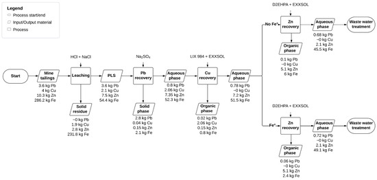 Combined leaching and metals recovery processes. Basis 1 ton of sulfidic tailings. Leaching of mine tailings with 10 g/L NaCl, 0.5 mol/L HCl, 70 °C, and 24 h; Pb recovery from the PLS with 4.15 SO42−/Pb2+ stoichiometric ratio for 30 min and 500 rpm; Cu recovery by SX with LIX 984 and EXXSOL at pH 1.5 for 15 min and 500 rpm; direct Zn recovery by SX with D2EHPA and EXXSOL at pH 3.0 for 15 min and 500 rpm; and reduction of Fe3+ to Fe2+ by addition Fe0 followed by Zn recovery with D2EHPA and EXXSOL at pH 3.0 for 15 min and 500 rpm.