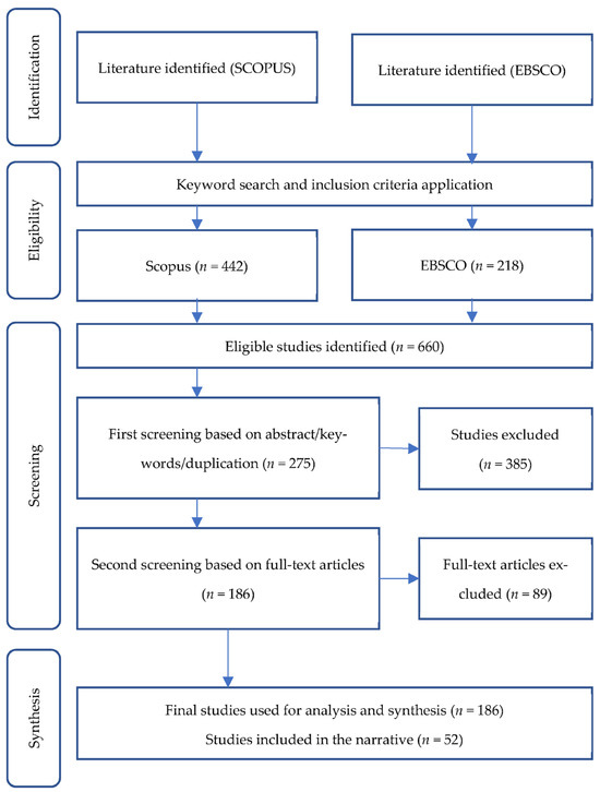 As shown in Figure 2 and Table 2, in total, the rapid review search yielded 660 articles. The search of Scopus identified 442 results and EBSCO had about 218 results. About 275 articles and abstracts were screened, removing 89 articles that were classified subjectively as being not relevant. Then, 186 full texts were downloaded and included in the analysis.