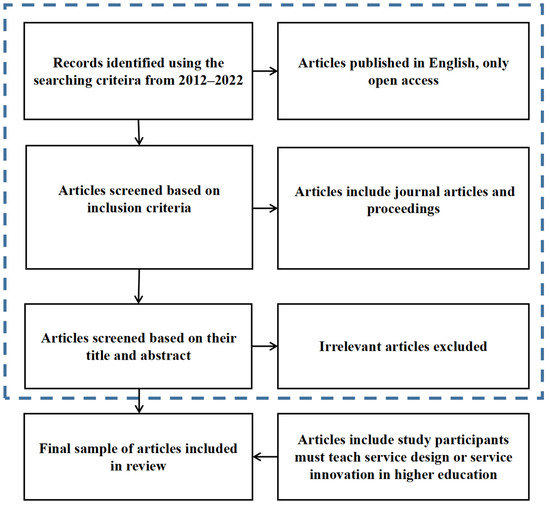 The aim of this study was to explore how service design education has currently been embedded with product design teaching using the literature as a primary data source. A bibliometric content analysis method [50] was used to address the research questions on the basis that such an approach can use the actual contents of research articles to identify commonly occurring concepts and map these occurring terms and their co-occurrences [51] (p. 1259). Although bibliometric research has been extensively employed in recent years, this is a new approach in this particular application context. Few studies have sought to investigate how service design pedagogies might stimulate product innovation using this approach. Bibliometric analysis aims to investigate the development status, the research areas of interest, the frontiers, and the trends [52] (p. 2).