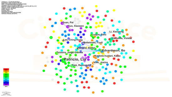 Scholars have used CiteSpace to map core authors and core research institutions. An author cooperation network map was used for the core author analysis (Figure 2). There were 256 nodes in the atlas, 258 connections, and a network density of 0.0079. The top three core authors identified were Patricio, Lia (five times), Edvardsson, Bo (three times), and Holmlid, Stefan (two times).