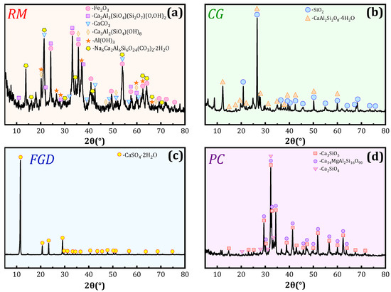 Experimental materials mainly consisted of RM, CG, FGD, and PC. Their chemical composition was analyzed with X-ray fluorescence (XRF) using a PANalytical Axios sequential X-ray fluorescence spectrometer made in the Netherlands (presented in Table 1). RM was obtained from the Shandong Xinfa Group Aluminum Factory and the main components were Fe2O3, Al2O3, SiO2, Na2O, and TiO2, accounting for 97.83% of the total mass fraction. Coal gangue was divided into coal gangue powder (CGP) and coal gangue granules (CGG). CGP was purchased from Hebei Lingshou County Jixi Mineral Products Co., Ltd. (Shijiazhuang, China), with SiO2 and Al2O3 as the main components, accounting for 83.35% of the total mass fraction. CGG was selected from a coal mine in Shanxi Province, and two types of CGG with particle sizes of 5-10mm (CGG1) and 10–15 mm (CGG2) were screened using a graded sieve as the coarse aggregate. FGD was taken from Hebei Shengyun Mining, and CaO and SO3 accounted for 99.83% of the total mass fraction, with the rest present as trace elements accounting for less than 0.2%. The PC was 42.5 ordinary silicate cement commonly found in the market, and the main components, CaO and SiO2, accounted for 84.92% of its composition, providing a large amount of calcium and silicon for the reaction. The water used in the experiment was tap water. As shown in Table 1, the RM and CG were enriched with cementitious agents such as SiO2 and Al2O3, and FGD was enriched with large amounts of CaO and SO3, whereas the cement was enriched with large amounts of CaO. Mineralogically, the main phases of the RM were hematite, zoisite, calcite, hydrogrossular, gibbsite, and calcite, while quartzite and calcium feldspar were the phases of CG. The FGD phase was dehydrated calcium sulfate while the phases of cement were tricalcium silicate and dicalcium silicate. The mineral phases of RM, CG, FGD, and PC were analyzed using XRD (Panalytical Empyrean, Almelo, The Netherlands), and their XRD patterns are shown in Figure 1.