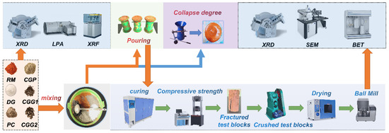 First, according to the parameter combinations in the orthogonal Table 2, each component of RM, CG, FGD, and PC was proportionally mixed and stirred by weighing it with an electronic balance (YP-6002; Tianjin Tianma Hengji Instrument Co., Ltd., Tianjin, China) to form the dry material of RMC, and then made into RMC by mixing and stirring it in accordance with the corresponding WSR. Then, the RMC was tested for its fluidity and setting time, and the standard specimens were prepared for the uniaxial compressive strength test after curing in a curing box for a specified time. Then, standard specimens were prepared for the uniaxial compressive strength test after curing in a curing box for a specified period of time. According to the test results of the first two stages, four groups of specimens with better results were preferably selected, and the center parts of the specimens after uniaxial compression at different ages were taken and crushed using a jaw crusher (EP-2; Hebi Innovative Instrumentation Co., Ltd., Hebi, China). Third, the crushed material was placed in an electric digital-display blast-drying oven (101-2A; Hebi City Innovative Instrumentation Co., Ltd.) and dried at 80 °C for 24 h. The dried, crushed specimens were put into a planetary ball mill with a stainless-steel grinding jar (YXQM-4L; Changsha Miqi Instrument and Equipment Co., Ltd., Changsha, China) and run at 500 rpm for 10 min. Finally, the samples that passed the 200-mesh sieve were selected for XRD, SEM, and BET tests and micro-mechanism studies. The specific experimental flow chart is shown in Figure 3.