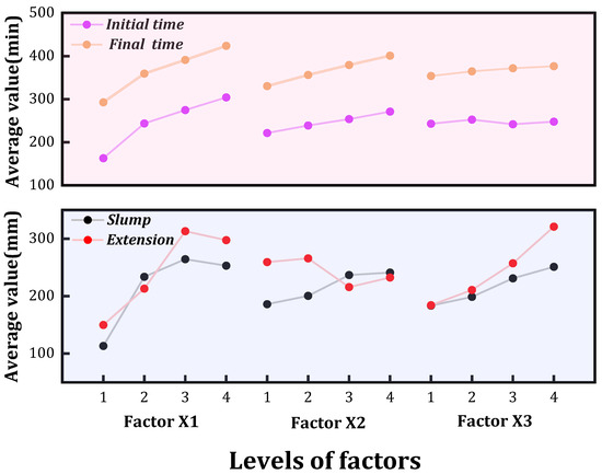 Setting time is the key factor to judge whether the filling material can be normally delivered to the hollow area over medium and long distances. As shown in Table 3, the initial setting time of the RMC was 125–331 min and the final setting time was 234–454 min. The results of the extreme value analysis of the setting time are shown in Table 5. The extreme values of the factors X1, X2, and X3, corresponding to the initial setting time, were 141.25, 49.5, and 10.75, respectively, and the extreme values of the factors X1, X2, and X3, corresponding to final setting time, were 131.25, 70.5, and 22.75, respectively. Therefore, it can be seen that the order of influence of each factor on the initial and final setting time of RMC is RM/CG > FGD/(RM + CG) > WSR. The factor mean curve for each level is shown in Figure 4, with both initial and final setting times increasing as the level values of each factor increase. This is due to the characteristics of fine aggregates such as RM, CGP, and PC, which have large specific surface areas and strong abilities to bind free water. The rate of paste setting increases with the increase in fine aggregate content. Second, it can be seen that the setting time of the RMC increases with the increase in FGD/(RM + CG), which is due to the fact that FGD tends to adhere to the surface of particles during the early hydration reaction process with the product of PC, ettringite crystals, which hinders the progress of the reaction and thus increases the setting time [49,50].
