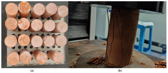 Preparation of specimens and experiments: (a) Specimens during the curing period; (b) Uniaxial compression test.