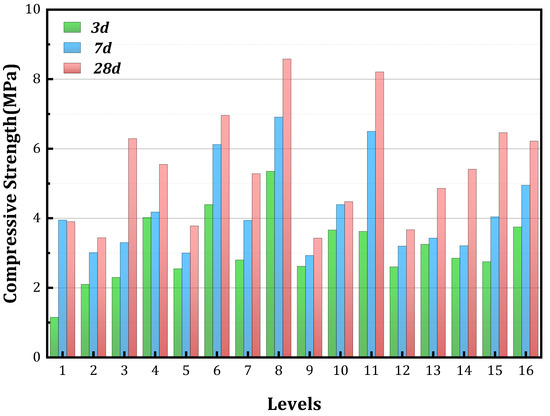 However, all of the above studies have the problem of low utilization of RM, so in this study, we prepared a filling material with 50–80% RM content, which has the advantages of high performance, low cost, and environmental friendliness. A three-factor, four-level orthogonal test with the mass rate of RM/CG, the mass rate of FGD/(RM + CG), and WSR was designed to analyze the RMC prepared from RM and CG, PC, and FGD with different levels of particle sizes, to test and analyze the compressive properties of the RMC and to study the synergistic effect and the activation mechanism. This work is expected to solve the problem of pollution caused by solid waste accumulation, provide theoretical guidance for the application of RM in the preparation of composite filling materials for mines, and also promote the sustainable development of green mines.