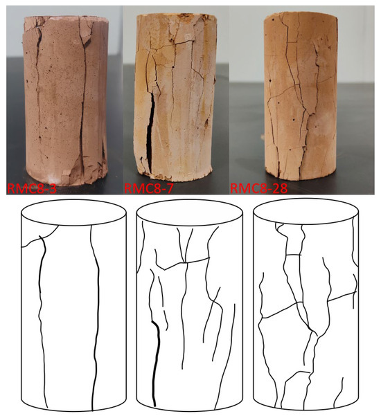 The surface crack propagation of the test piece is shown in Figure 7. Taking RMC8 as an example, when the strength of the test piece is low, the surface of the loaded specimen has a single form of fracture. The failure surface of the 3 d old specimen mainly exhibits a single approximately inclined or two approximately parallel through-going main cracks in the axial direction. The specimen mainly fails due to cleavage and has large cracks. With the increase in the curing time, the test specimens exhibit various forms of damage, with apparent cracks on the surface primarily forming and penetrating in a vertical or nearly vertical direction, then spreading and intersecting in a horizontal direction. The specimens primarily suffer from cleavage failure and shear failure [53]. The number and length of cracks with larger damage states on the surface of the specimen gradually decrease, which may be due to the low degree of the early hydration reaction, the high porosity and low compactness of the specimen, and the rapid loss of the load-bearing capacity and large damage cracks in the uniaxial compression process, based on initial defects such as pores. As the hydration reaction continues, the hydration products fill the original pores of the porous structure and composite system of coal gangue, resulting in a high density of the sample. The synergy between coarse and fine aggregates enhances the compressive bearing capacity of the composite system. With the application of continuous load, the specimen gradually reaches the bearing limit, manifested by the continuous development of surface cracks, which intersect and connect until the specimen completely loses its bearing capacity (compared to the lowest degree of crack shape damage) [54,55]. The remaining groups exhibit similar patterns.
