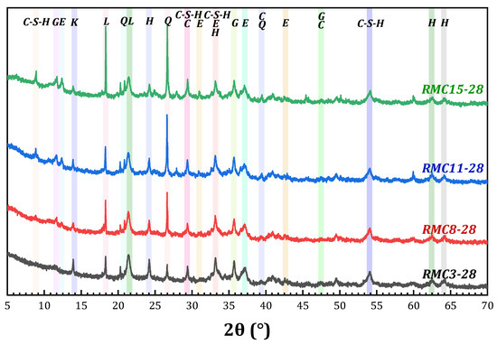 XRD patterns of RMC3, RMC8, RMC11, and RMC15 after 28 curing days (Q: quartz; H: hematite; E: ettringite; G: gmelinite; P: portlandite; C: calcite; L: lawsonite; K: kroehnkite).
