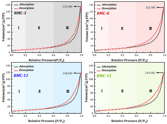 In stage I, N2 forms a typical monolayer adsorption in the micropores on the RMC surface. With the increase in relative pressure, it can enter stage II (steady rise) more quickly, and then rise sharply (stage III). The insignificant change in curvature at point B of the four sets of adsorption/desorption isotherms indicates a substantial overlap of the monolayer coverage and the onset of multilayer adsorption. The sharp increase in the curvature of the adsorption/desorption isotherms is due to the gradual formation of the multilayer adsorption structure and unrestricted adsorption close to the N2 saturation vapor pressure. When P/P0 = 1, the thickness of the adsorbed multilayer film generally showed an unlimited increase. At this vapor pressure, the amount of N2 adsorbed by the RMC reached 153.1039 cm3/g, 132.705 cm3/g, 118.2449 cm3/g, and 119.1624 cm3/g, respectively. From the adsorption/desorption curves, the presence of H3-type hysteresis loops (IUPAC classifications) indicated the presence of fissure structures, cracks, and a wedge-shaped RMC structure [59].