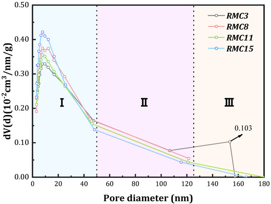 According to the pore size distribution curve, it can be seen that the pores of the four groups of specimens are mainly distributed in region I, and the peak size classification is RMC15 (0.00422) > RMC8 (0.00375) > RMC11 (0.00355) > RMC3 (0.00329). The reason for this pattern may be caused by the different contents of the porous structures of the raw materials. The higher the content of coarse aggregate, the more primary small pores it contains, and the larger the volume of pores in region I, which should be manifested as RMC15 > RMC11 > RMC8 > RMC3. However, the reason for the opposite pattern of RMC11 and RMC8 is that the RMC8 system is able to carry out a more complete hydration reaction under the optimal gradation. Therefore, it produces more gel, meaning a large number of gel filling packages bond to the original coarse aggregate surface or pores, forming a stable dense overall structure-a “false”-type coarse aggregate. Thus, after crushing, it shows the original coarse aggregate properties and increases its small pore content. In region II, the mesopore distribution curves are parallel and not very different. In region III, macropores exist only in the RMC3 group and not in the remaining three groups. This is because the system only contains fine aggregate, which requires too much water during the hydration reaction, making it difficult to fully react. The amount of gel generated is extremely low, which makes it impossible to closely lap the original powder materials to form a stable structure, resulting in many large holes in its interior. When the load is applied, the easily broken area collapses, so the compressive strength is relatively low.