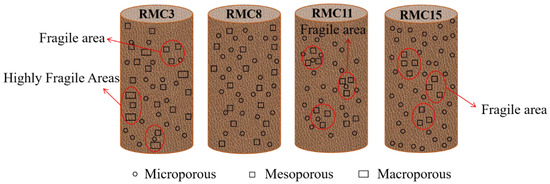 The specific pore distribution of RMC is shown in Figure 10. As shown in Figure 11, the approximate locations of the pore distributions in the four groups of specimens after uniaxial compressive testing were simulated and plotted in this study based on the specimen compression damage physical diagrams, where the large pore aggregation site is called the highly fragile area and the medium pore aggregation site is called the fragile area. According to the pore distribution and pore size in the four groups of RMC, they were categorized into three regions: region I, 2 nm < PD < 50 nm; region II, 50 nm < PD < 125 nm; and region III, PD > 125 nm.