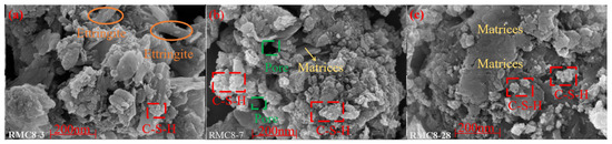 All the above experiments proved that RMC8 has superior performance in all the indices, so the SEM images of the 3-, 7-, and 28-day-old RMC8 specimens were studied with the aim of revealing the hydration process and the microreaction mechanism at the optimal ratio. As shown in Figure 12, a large number of ettringite and C-S-H gels are present in the SEM image (a) of the specimen at 3 days of curing, indicating that in the early stage of the reaction, the hydration reaction products of PC and FGD provided the specimens with early strength. In the SEM image (b) of the specimen at the age of 7 days, a large number of C-S-H gels are shown to have aggregated to fill in the pore spaces, but pores still existed, which was attributed to the fact that hydration is a relatively slow process, and in the pre-conservation period, fewer C-S-H gels were produced. With the increase in curing age, SEM image (c) shows that the C-S-H gel produced by the hydration reaction gradually increased and gathered together to fill the pores between the aggregates, reduce the total porosity, and produce a dense matrix to make the specimen more stable, which is macroscopically manifested in the increase in specimen strength. SEM images and discussions of RMC3, RMC8, RMC11, and RMC15 are shown in the Supplementary Materials.