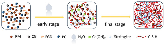 Through the analysis of the above RMC enhancement mechanism, the hydration process model of the RMC is shown in Figure 13. In the early stages, the vigorous reaction of the feedstock is mainly the hydration reaction of PC and FGD. The hydration products, fine-needle-like calcite, fibrous C-S-H gel, and raw material particles, lap and intertwine to provide a certain degree of stable structure for the system. As the hydration reaction proceeds, the active substances in RM and CGP dissolve in the alkaline environment to participate in the hydration reaction. A large number of chalcocite crystals grow continuously to fill the pores in the system and reduce the proportion of harmful pores. The fine, fibrous C-S-H gel develops from an amorphous shape to a reticular structure and gels the unreacted loose particles to form a dense structure.