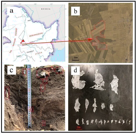 Location map and soil profile residual film in the study area: (a) farm location map; (b) satellite map of the residual mulch survey study area at the farm; (c) the presence of residual film in soil profiles; and (d) collected residual mulch of various sizes.