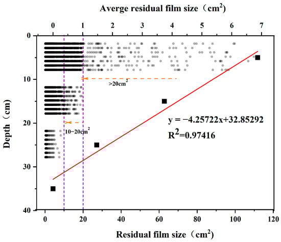 A total of 5349 residual membranes were collected in the study and their size was analyzed (Figure 2). The surface area of the collected residual film fragments ranged from 0.25 cm2 to 109 cm2. Among them, the residual film fragments with a surface area of 0.17–10 cm2 showed the widest distribution range, visible in soil of 0–30 cm depth. Residual film fragments with a surface area of 10–20 cm2 existed in the 0–20 cm soil layer, while those greater than 20 cm2 occupied the 0–10 cm surface soil layer.