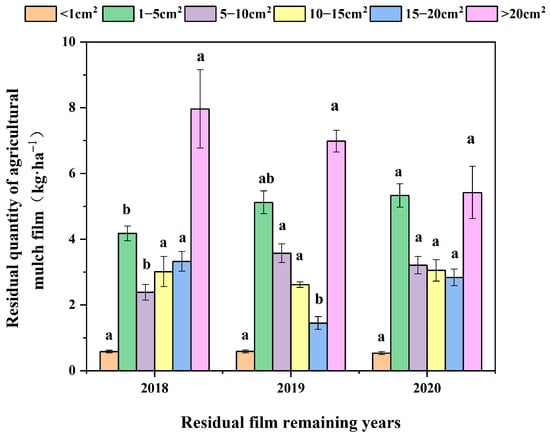 The experiment, conducted over a period of 3 years, studied the changes in the residual quantity of different-sized film residues in the soil over time without adding new mulch film. Overall, the residual quantity of agricultural mulch film in the surface soil (0–40 cm) decreased from 21.44 kg·ha−1 in 2018 to 20.39 kg·ha−1 in 2020. The average annual decline rate of the residual quantity of agricultural mulch film was only 0.525 kg·ha−1. The residual quantity of large-sized agricultural films (>20 cm2) in the soil consistently decreased over time, from 7.96 kg·ha−1 to 5.42 kg·ha−1 (Figure 3). The residual quantity of films sized 10–15 cm2 and 15–20 cm2 displayed a consistent pattern of decrease followed by an increase. Among them, the residue of 10–15 cm2 residual film showed no significant change, whereas the residue of 15–20 cm2 film showed a significant decrease from 3.32 kg·ha−1 in 2018 to 1.45 kg·ha−1 in 2019. As for residual film fragments ranging from 5 to 10 cm2 in size, their residual quantity increased initially and then decreased over time, showing a significant change (p < 0.05), and the residual quantity in 2020 increased by about 35% compared with 2018. It is worth noting the changes in the residual amount of smaller film residues over time. As time goes on, there is a significant increasing trend (p < 0.05) in the small residual film fragments within the 1–5 cm2 range, with an approximately 28% increase in residues in 2020 compared to 2018. However, the residue of the smallest film fragments (<1 cm2) gradually decreases over time, and the change is not significant.