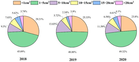 The number of residual film fragments exhibited a generally increasing trend from 2018 to 2020. Specifically, the average growth rate from 2018 to 2020 was 2.13 × 105 p·ha−1. The research findings revealed that in the absence of new low-density polyethylene plastic mulch injection into the soil, the residual film of various sizes displayed a complex temporal pattern. However, the relative proportion of large residual film (>20 cm2) (i.e., the occurrence frequency of residual film fragments relative to the total number of residual film fragments) increased annually (Figure 4). Its share increased from 3.7% in 2018 to 4.1% in 2020. The relative proportions of residual film fragments in the size ranges of 10–15 cm2 and 15–20 cm2 showed a trend of initially decreasing and then increasing. In 2020, they decreased by 4.50% and 1.01%, respectively. The pattern of variation for the 5–10 cm2 range was the opposite, showing an initial increase followed by a decrease. In 2020, it increased by 2.29%. Among them, the relative proportion of residual film fragments in the 10–15 cm2 size range exhibited a larger magnitude of change over time. The relative proportion of fragments in the 1–5 cm2 size range constituted the highest percentage, accounting for 45–49% of the fragment count, and their number proportion continued to increase over time, eventually increasing by 4.23%. The relative proportion of residual film fragments in the size range of <1 cm2 ranked second to the 1–5 cm2 components, with a relative abundance of 25% to 29%. However, over time, the proportion showed a downward trend, eventually decreasing by 5.41%.