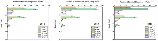 The number of medium-sized residual film fragments (5–10 cm2 and 10–15 cm2) in the 0–10 cm soil layer was 17.2 ± 2.27 × 104 p·ha−1 and 19.0 ± 3.41 × 104 p·ha−1, respectively. As the soil depth increased, the decrease in the number of these two groups of small fragments became more pronounced. In the soil at a depth of 30 cm, the number of residual film fragments of size 5–10 cm2 decreased to 1.2 ± 0.58 × 104 p·ha−1, while fragments of 10–15 cm2 in size did not appear in the 30 cm depth soil layer. The variation in these two medium-sized residual film fragments was more complex across different soil layers over time. However, over the entire time period, the quantity of 5–10 cm2 fragments increased in the 0–30 cm soil layers, with the most stable increase observed in the 20–30 cm soil layer, from 1.2 ± 0.58 × 104 p·ha−1 in 2018 to 3.6 ± 0.81 × 104 p·ha−1 in 2020. Additionally, in 2019, there was a significant increase in the number of 5–10 cm2 residual film fragments in the 0–10 cm soil layer, followed by a substantial decrease in 2020. However, in the 10–20 cm depth soil layer of the same year, there was no significant increase in the number of fragments of the same size, indicating the occurrence of fragmentation and degradation of the 5–10 cm2 fragments over a two-year period.