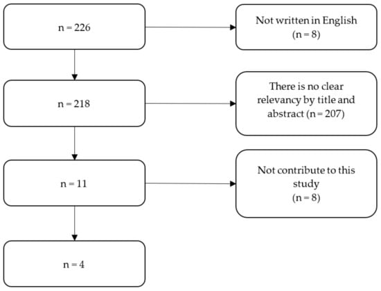 RQ 2 investigates the primary challenges for airports to enable hydrogen-powered flights and where these requirements should be reflected in the airport planning process. The research team conducted a systematic literature review (SLR) to comprehensively search for literature that focuses on requirements for airports to enable hydrogen flight by following the Preferred Reporting Items for Systematic Reviews and Meta-Analyses (PRISMA) guidelines [19]. The authors used ‘Hydrogen’ and ‘Airport’ to search in the Scopus database. The keywords appeared in the titles, keywords, or abstracts of 226 papers in the database. Then, the 215 papers that were not written in English and that had no clear relevancy by title and abstract were removed. The research team reviewed the remaining 11 peer-reviewed papers and found that only four of them had significance and are thus used in this study [20,21,22,23]. The selection process is shown in Figure 1.