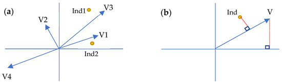 In graphs Figure 1a,b the axes of the planes represent the components that have the greatest representativeness of the individuals (Ind) and variables from the results of a PCA. (a) each vector represents a variable within the study and its graphical interpretation shows the degree of relationship, for V1 and V3 the relationship of the variables is strong because their angle is acute and the more the angle is shortened the greater the relationship, If the angle they form is 90°, in the case of V1 and V2, their relationship is zero. While the angle is obtuse, as in the case of V4 and V1, their relationship is inverse. (b) The angle formed by the vector projected towards the axes provides the information with which component there is a greater relationship. The angle formed by the projection from the individual (Ind) to a vector shows that there is a greater relationship with one variable or the other.